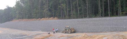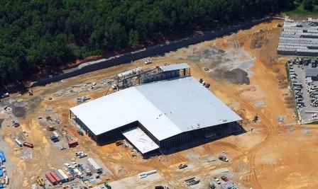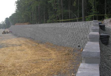 Aeriel and long range pictures of the Allied Concrete Products, LLC's new state of the art manufacturing facility in Chesterfield County, Virginia; and the dry stack block segmental retaining wall. The retaining wall can be seen in the aerial photo just below the tree line.