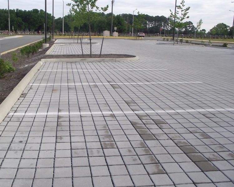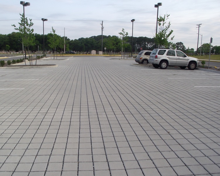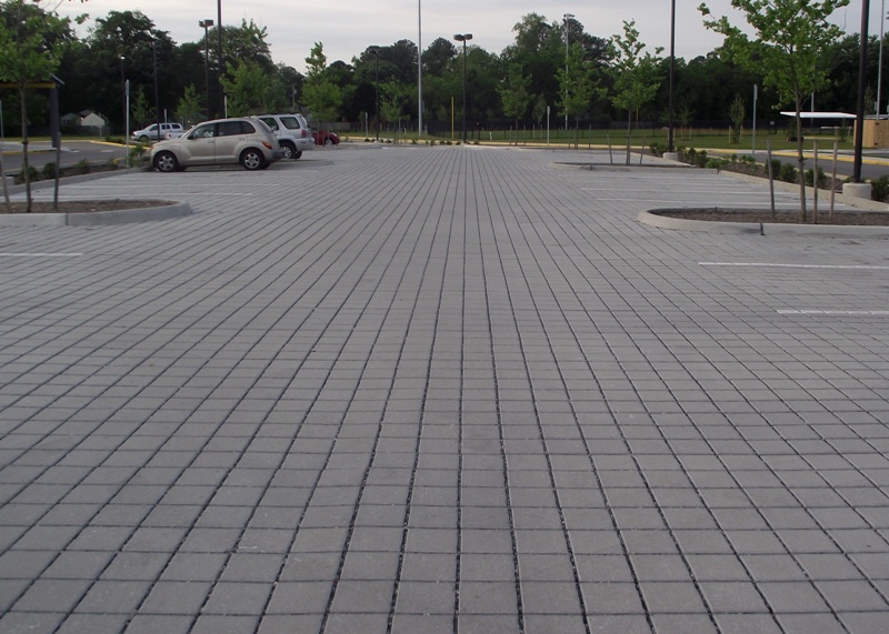 Looking across the parking lot of permeable concrete pavers |